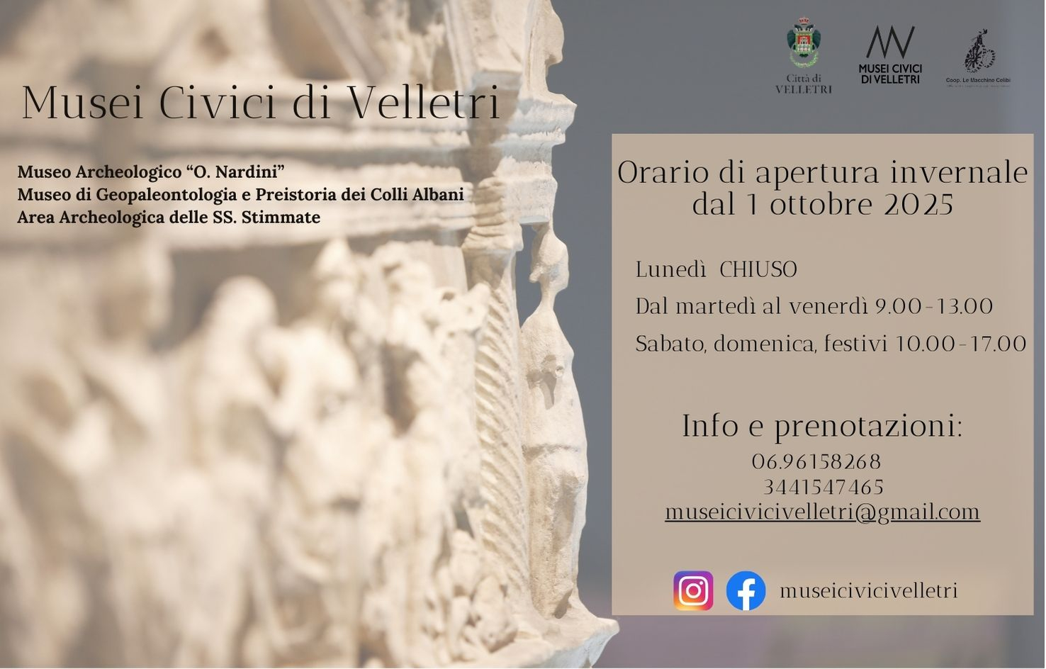 Dopo un breve periodo di chiusura per ristrutturazione e rifacimento degli interni, Riapre al pubblico il Museo Civico Archeologico di Velletri. L'origine collezionistica della raccolta, la nascita del museo nel periodo post-unitario e il clima culturale dell'epoca in cui gli Ispettori Onorari svolsero un ruolo fondamentale per la tutela del territorio nazionale rappresentano la nuova chiave di lettura dei nuovi itinerari che sono stati presentati alle autorità Giovedì 17 Novembre alle ore 10.30. Importanti acquisizioni, provenienti da scavi recenti, sono state inserite e valorizzate con nuovi restauri e allestimenti e, talvolta, con la ricostruzione di antichi contesti (tra cui un’area di scavo di un settore di villa romana). Il principio che ha ispirato il nuovo allestimento è quello del "Work in progress” per i continui apporti che provengono da nuovi scavi, favorendo la possibilità di fruire immediatamente di quanto rinvenuto con l'inserimento anche di materiali che saranno sottoposti a restauro solo successivamente.