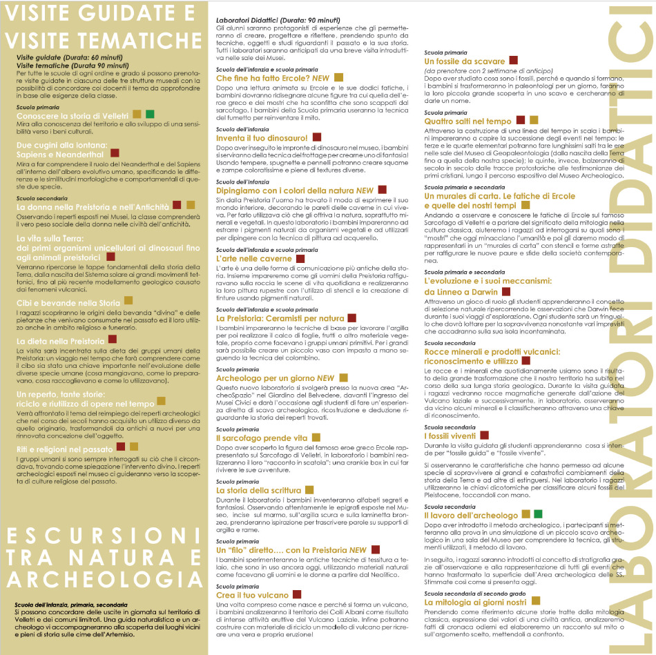 I Servizi Educativi organizzano attività (visite guidate, laboratori, escursioni e progetti speciali) rivolte a bambini, famiglie e agli studenti di ogni ordine e grado per condurli alla scoperta delle collezioni dei Musei Civici di Velletri.